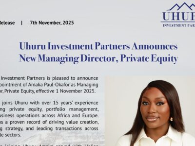 Uhuru Investment Partners is pleased to announce the appointment of Amaka Paul-Okafor as Managing Director, Private Equity, effective 1 November 2025.